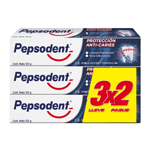 - La Pasta Dental Protección Anti Caries de Pepsodent es la elección ideal para quienes buscan una solución efectiva para el cuidado bucal diario. Con un formato de crema, esta pasta dental se presenta en un práctico paquete de 3 tubos de 130 g cada uno, sumando un total de 390 g. Su fórmula avanzada está diseñada para combatir las caries, proporcionando una protección duradera y ayudando a mantener una sonrisa saludable.